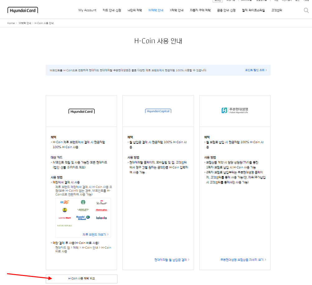 5. M혜택 안내 -> H-Coin 사용 안내 메뉴를 선택합니다.