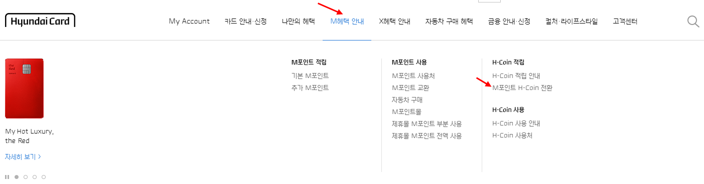 2. 홈페이지에서 M혜택안내 → M포인트 H-coin 전환을 선택합니다.