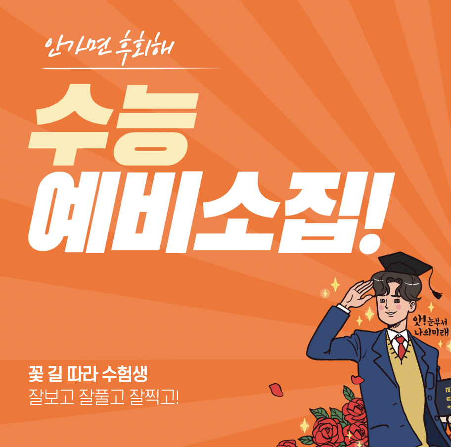 수험생분들은 머리도 식힐겸, 미리 고사장에 가셔서 주변 분위기도 한 번 보고, 시뮬레이션을 꼭 해보시길 바랍니다. 수능 전날에는 너무 맵고 짠 음식보다는 순한 음식으로 저녁 식사를 마무리하시길 바랍니다. 지금껏 노력했던 만큼 좋은 결과로 보답받으시길 바랍니다.