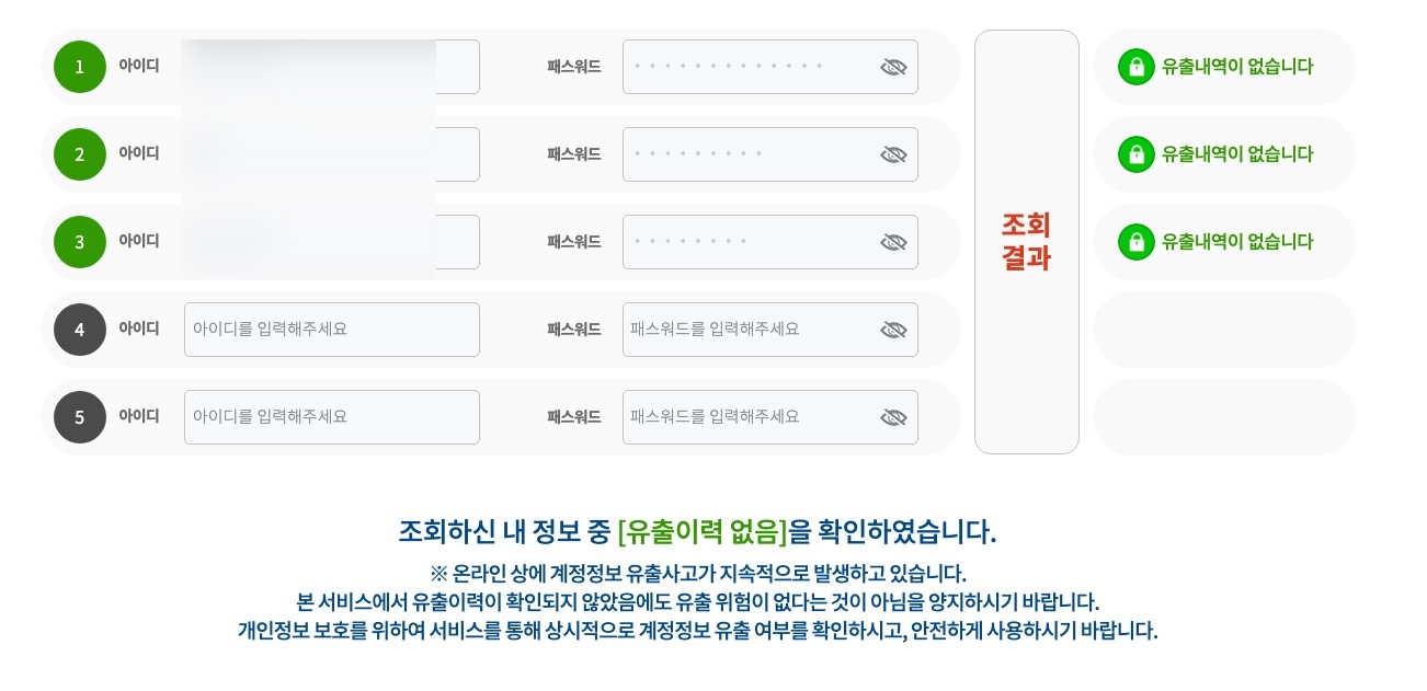 일단 기억나는 아이디와 비밀번호 3가지를 조회해봤는데 유출 내역이 없다고 나왔습니다. 여기서 유출내역이 없다고 해서 해킹 위험은 아예 없는 것은 아니지만, 그래도 관리가 잘 되고 있다는 것 같아서 뿌듯했습니다.